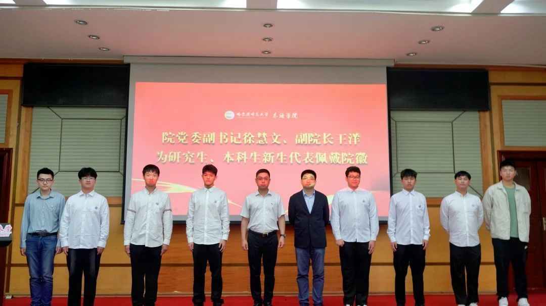徐慧文、王洋为研究生、本科生新生代表佩戴院徽。至此,2024级全体新生正式成为光荣的东语人,承载起属于搜搜啪