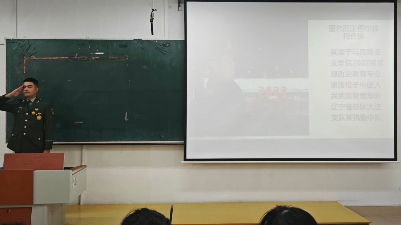 在社科楼452教室开展国防教育暨征兵宣传专题讲座,此次讲座邀请就读于马克思主义学院2022级思想政治教育专业(原服役于中国人民武装警察部队)图尔贡江担任主讲。
