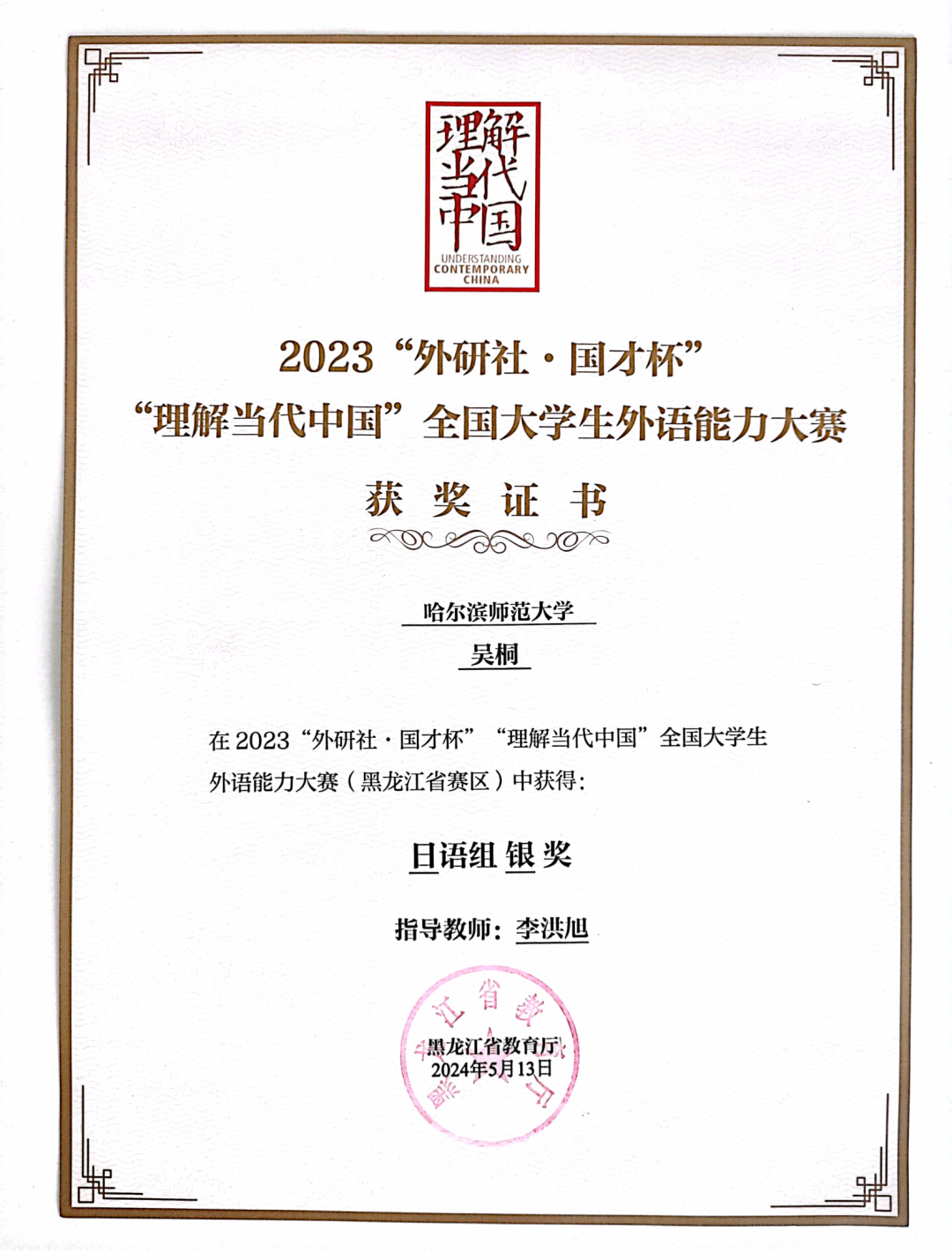 (吴桐/文)2023年度“外研社・国才杯”“理解当代中国”全国大学生外语能力大赛日语组黑龙江省赛区的获奖名单及证书,已于近期正式揭晓并颁发。此次大赛以“理解中国,沟通世界”为宗旨,旨在引导参赛选手深刻领悟习近平新时代中国特色社会主义思想的核心内涵,全面理解中国的发展道路、治理体系和理论体系,培养家国情怀与国际视野,拓宽知识边界与思维深度,充分展现外语交流、跨文化理解、批判性思维及创新能力等综合素养。