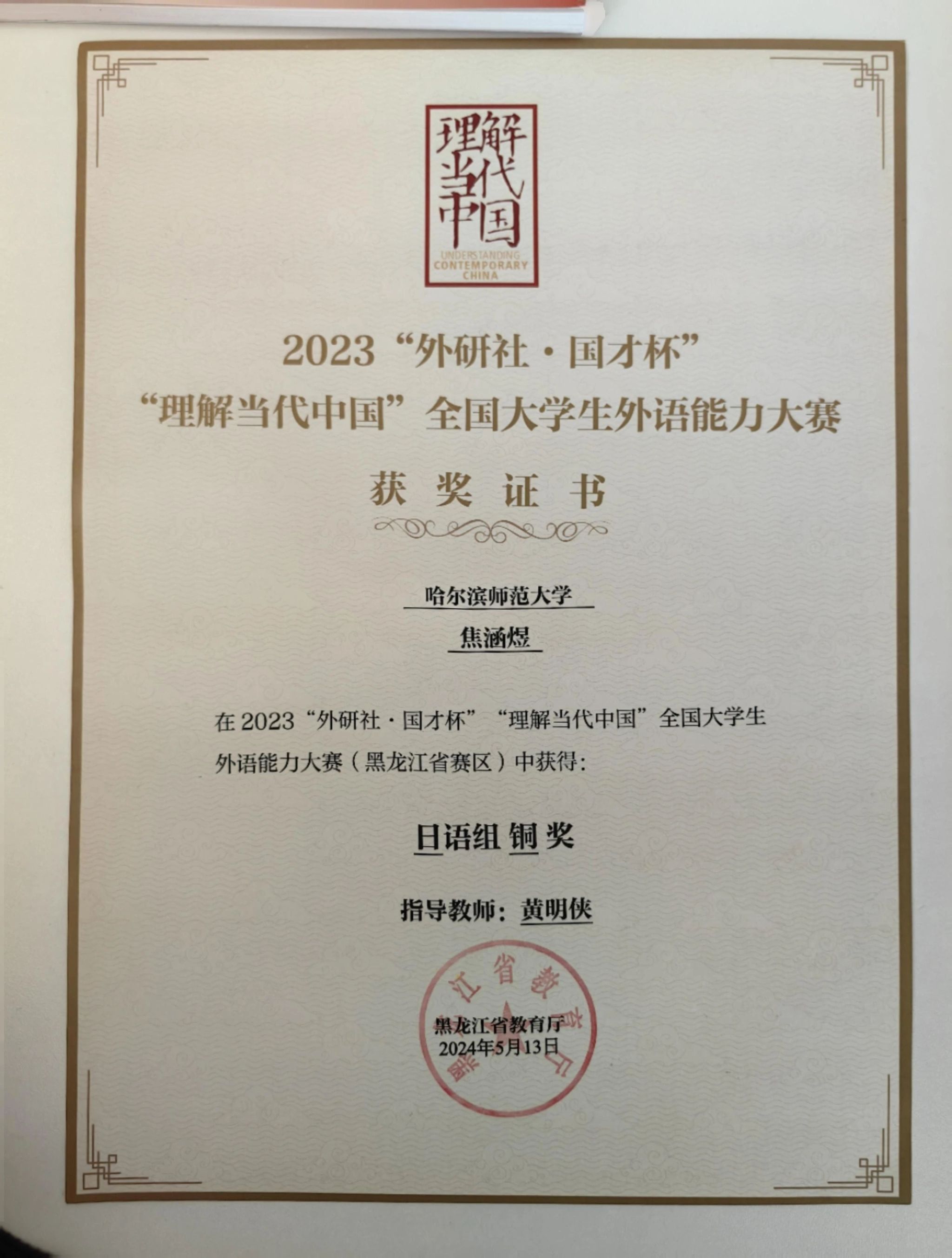 2020级日语教育专业的焦涵煜同学,在日语系黄明侠老师指导下,获得黑龙江省赛区铜奖(多语种组·日语组)。