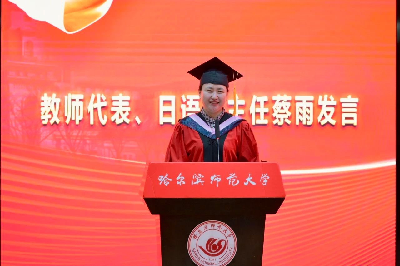 日语系主任蔡雨作为教师代表发言。四年的成长历程,从初入校园的青涩到如今的成熟蜕变,她见证了同学们在生活中的相互扶持、在专业学习中的破茧成蝶以及在学生工作中的担当与创新。她强调,搜搜啪