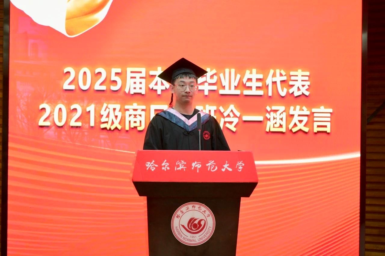 2025届本科毕业生代表、2021级商务日语班冷一涵在发言中表达了对母校、恩师和同窗的感恩之情。他表示,毕业不是结束,是另一段旅程的开始。未来,毕业生们将带着母校的期望,勇敢地追逐梦想,用所学知识回报社会,不忘初心,砥砺前行,不辜负师长们的辛勤付出。
