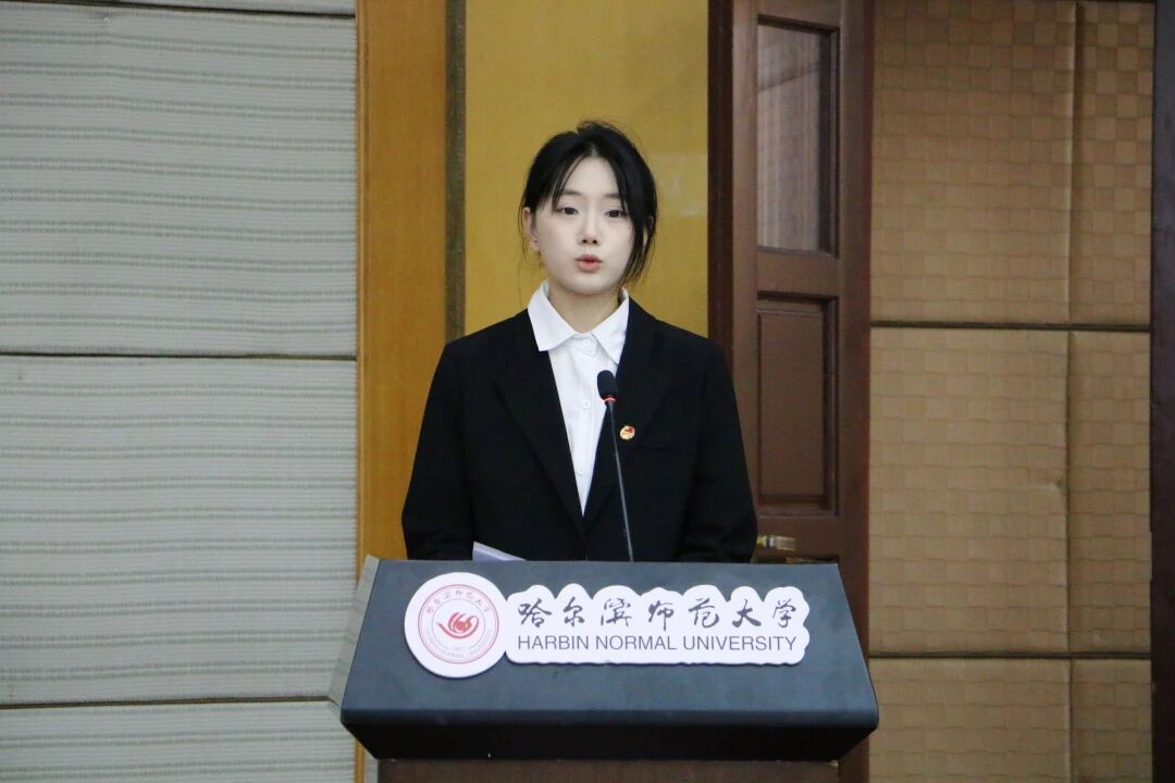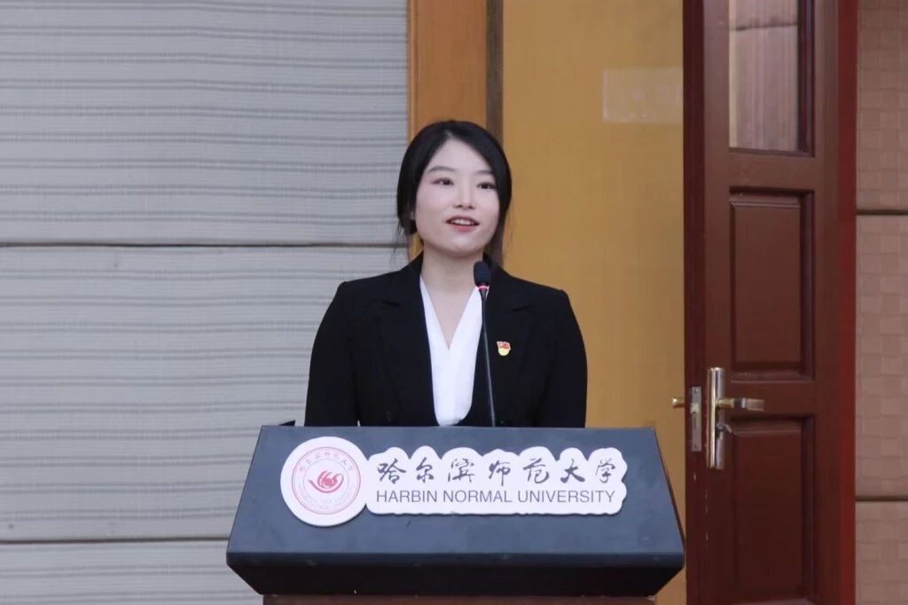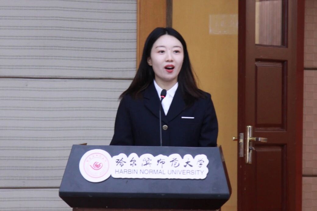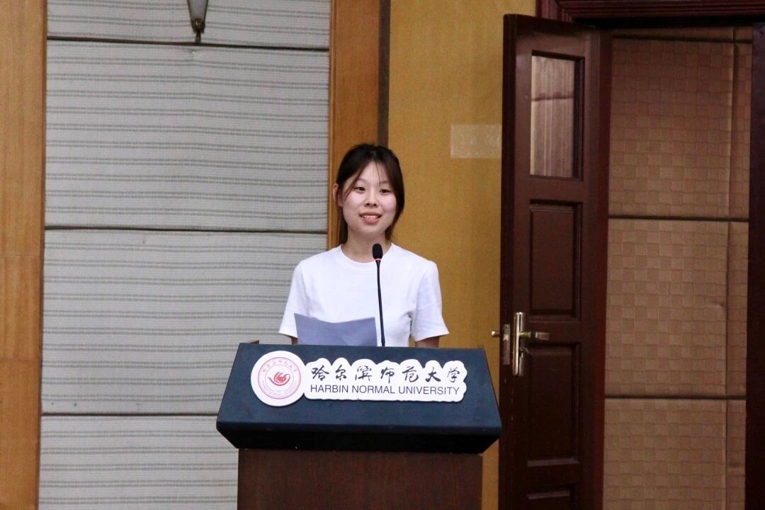 研究生新生代表、2025级日语笔译专业闫涵分享成长故事,她提及军人家庭传承的坚韧品格,以及受哈师大搜搜啪