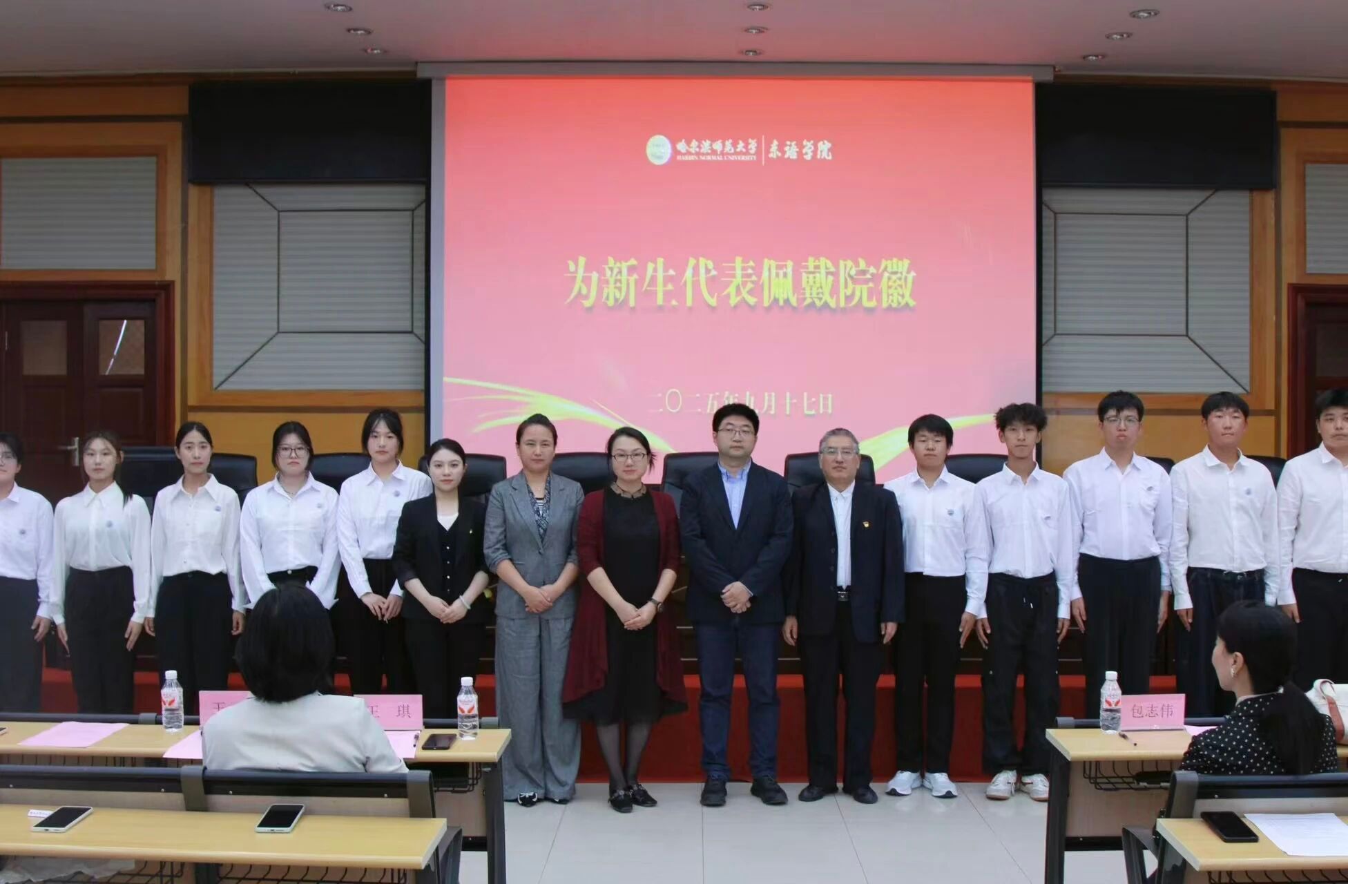 副院长郑杨,副院长王洋,副处级辅导员史许福,日语系主任蔡雨,团委副书记兼学生工作办公室副主任杨博文共同为新生代表佩戴院徽。当崭新的院徽别在胸前,标志着2025级新生正式成为“东语人”,从此肩负起学院的荣耀与使命,踏上逐梦新征程。