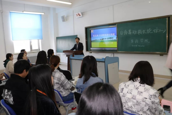 于4月26日在社科楼举办第一届“日语基础教育校长论坛”,尚志市朝鲜族中学安永奎校长、白亮副校长为16级日语教育专业学生和老师做了精彩讲座。