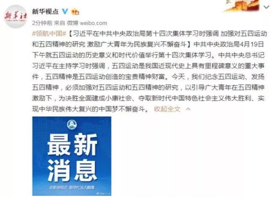 中共中央政治局4月19日下午就五四运动的历史意义和时代价值举行第十四次集体学习。