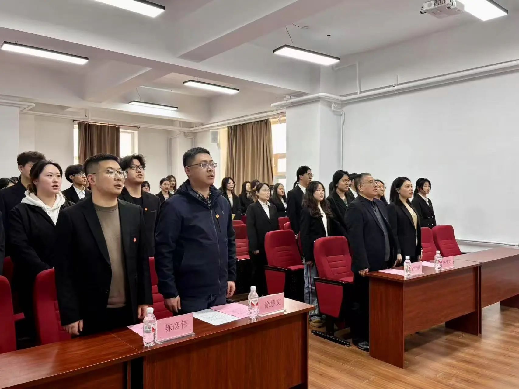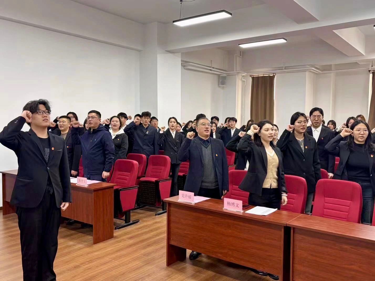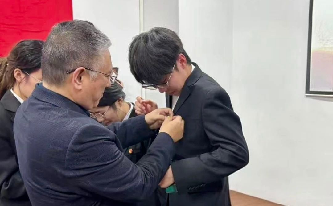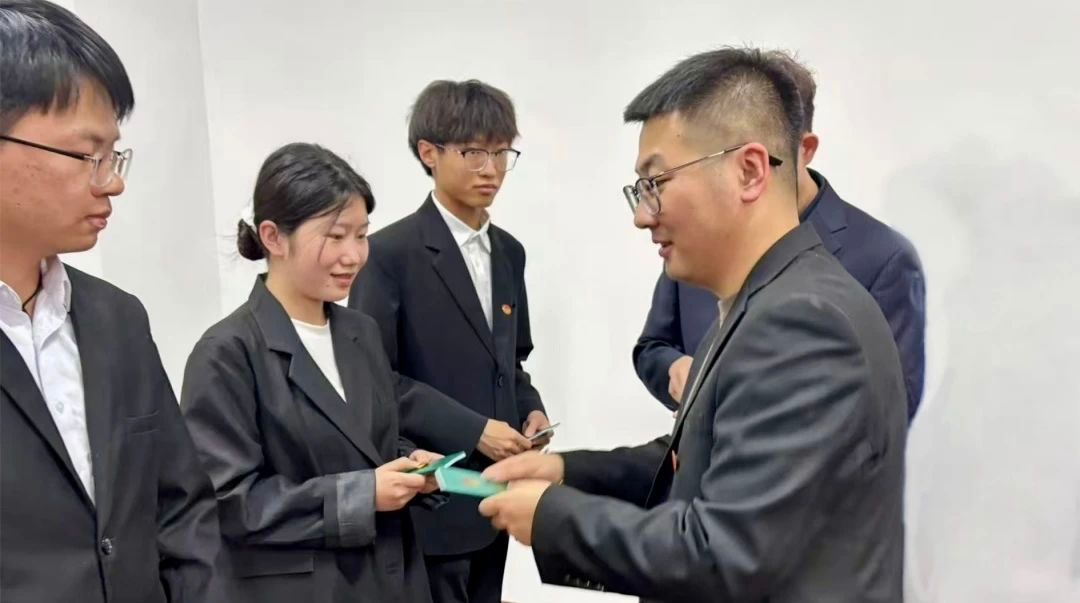 伴随着庄严的国歌声,入团仪式正式拉开序幕。在杨博文郑重宣读新团员名单后,史许福、陈彦伟为新团员佩戴团徽并颁发团员证。这一光荣时刻让新团员们深切感受到自己身份的转变与肩上沉甸甸的担当。