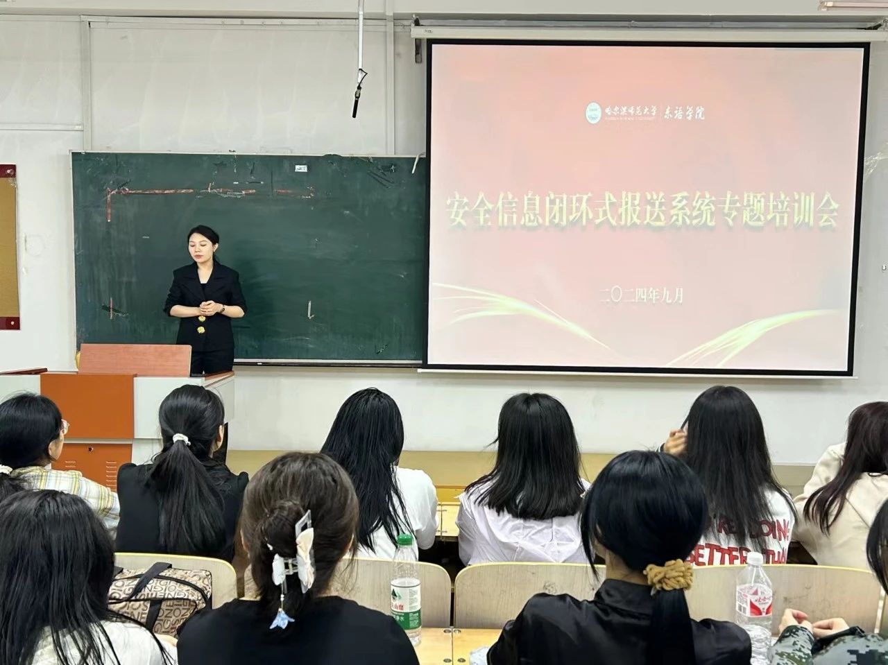 于社科楼452教室召开安全信息闭环式报送系统主题培训会。此次大会由新生辅导员杨博文主讲,2024级全体新生参加会议。
