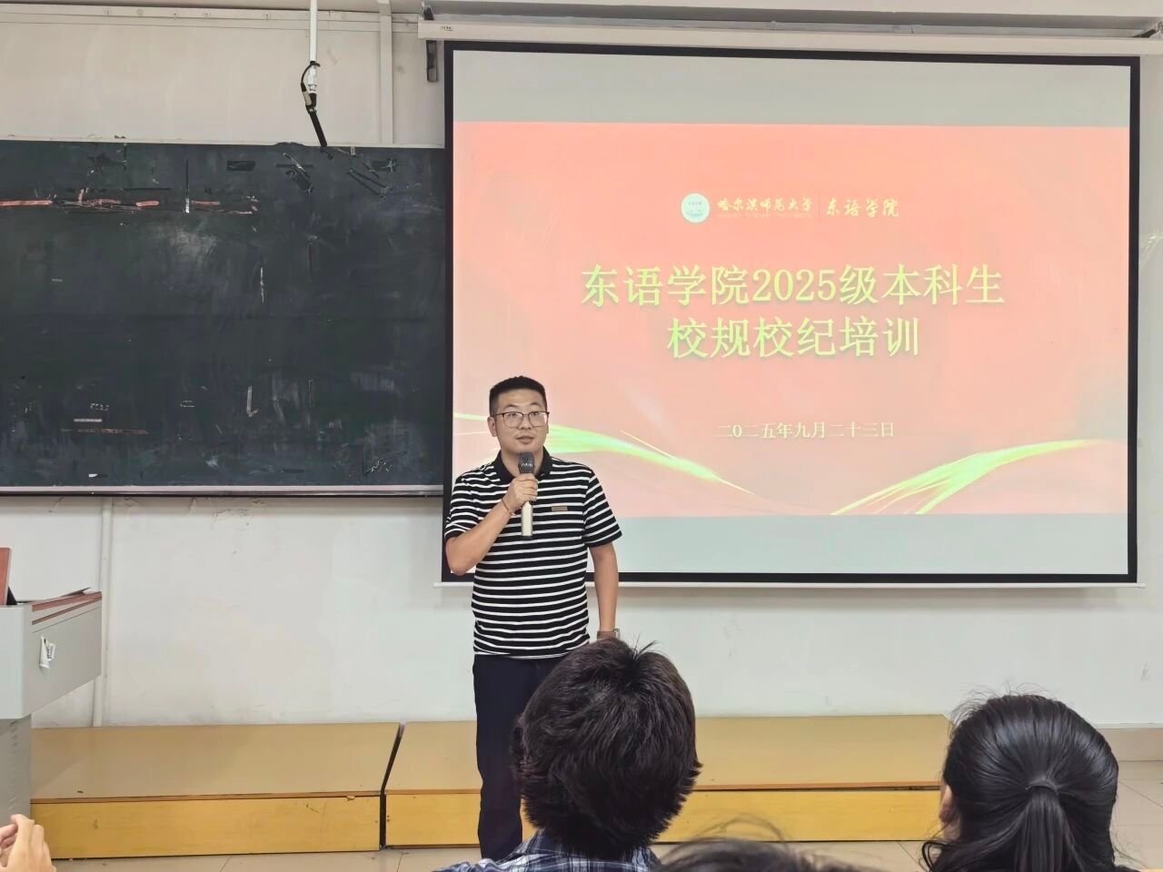 组织全体2025级新生在社科楼452室开展校规校纪培训会。活动由学工办主任兼团委书记、2025级本科生辅导员陈彦伟担当主讲。