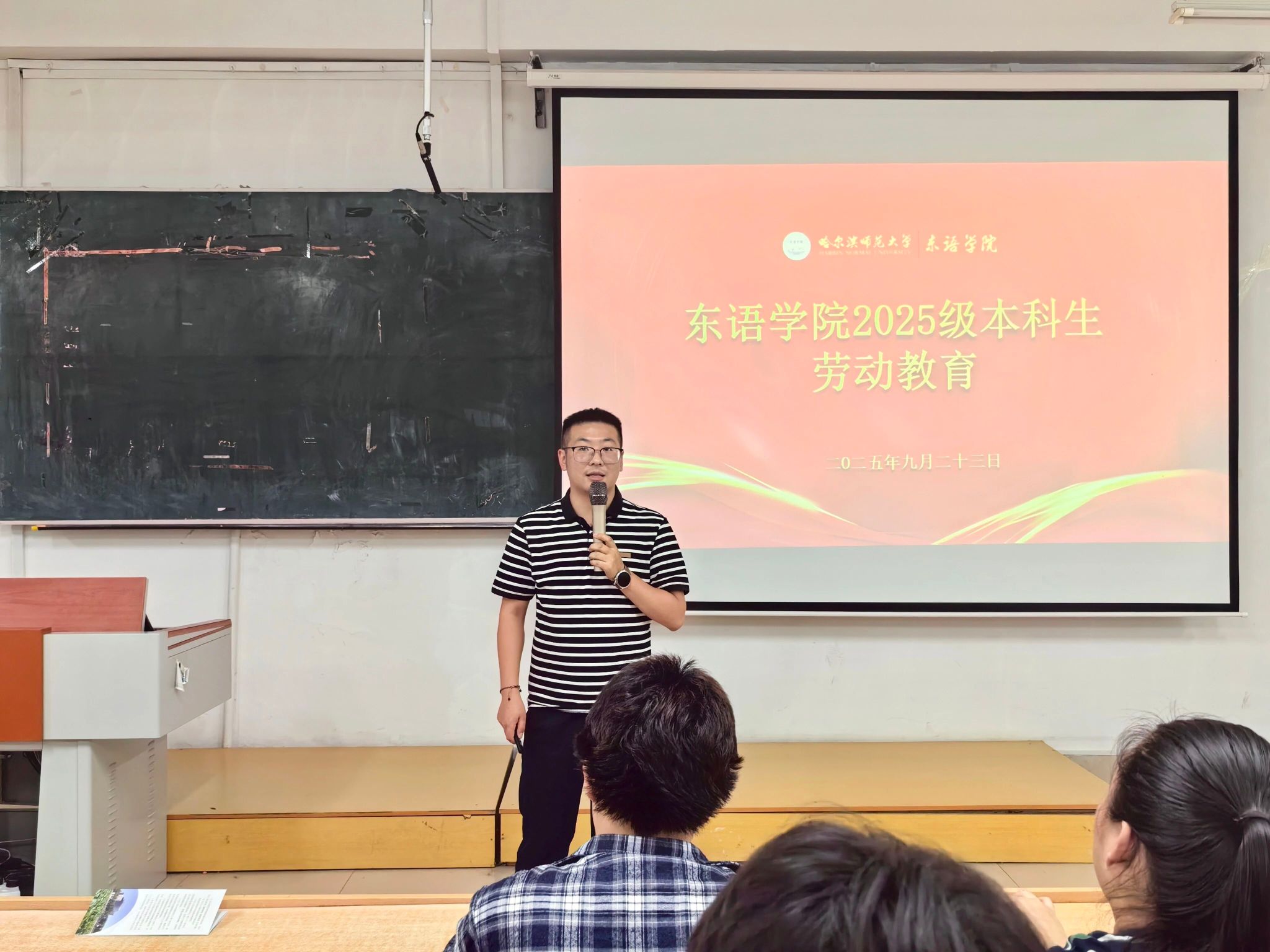 在社科楼452教室召开2025级本科生劳动教育大会。学工办主任、团委书记、2025级本科生辅导员陈彦伟担任主讲,2025级全体本科生参会。