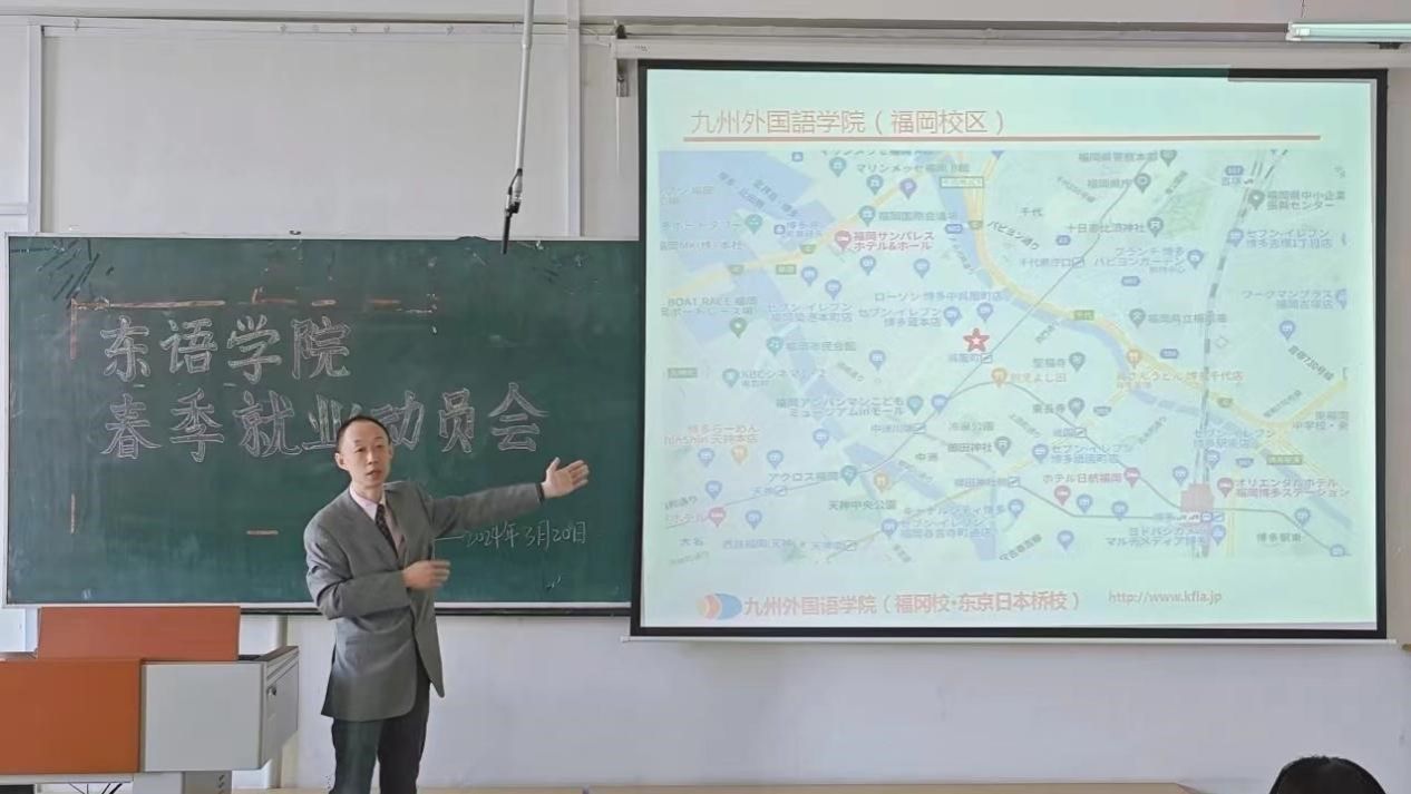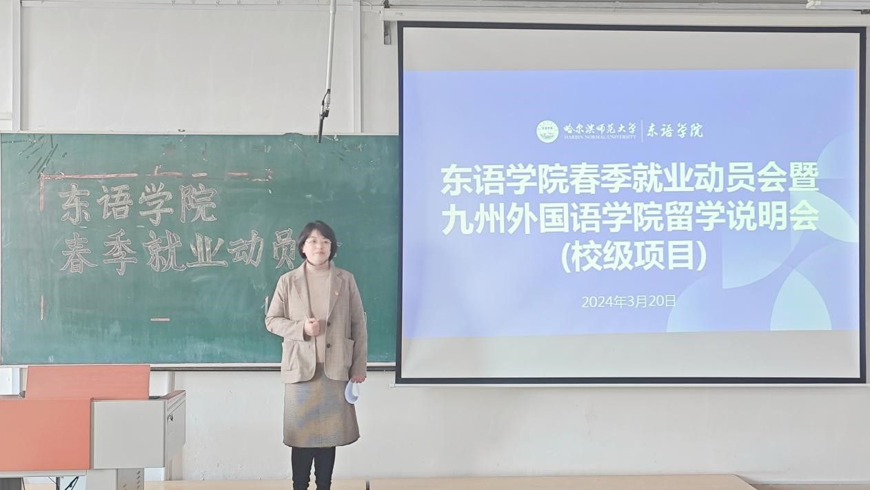 春季就业动员会暨九州外国语学院留学说明会(校级项目)。会议邀请日本九州外国语学院中国事务所主任马志良进行分享指导,由王琪院长主持会议。