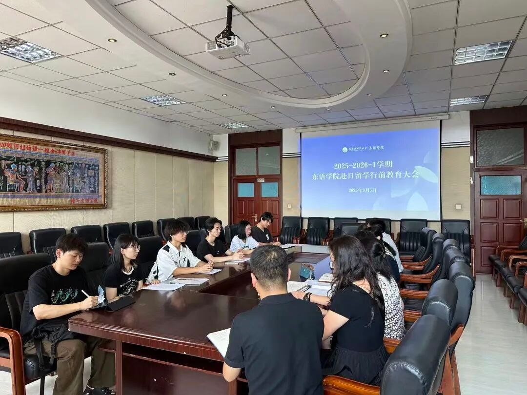 在社科楼313室举办出国行前教育大会,学院党委书记包志伟、院长王琪、副院长郑杨、副院长王洋、副处级辅导员史许福、日语系主任蔡雨、2023级辅导员陈彦伟及全体即将出国的同学参加会议。会议由包志伟主持。