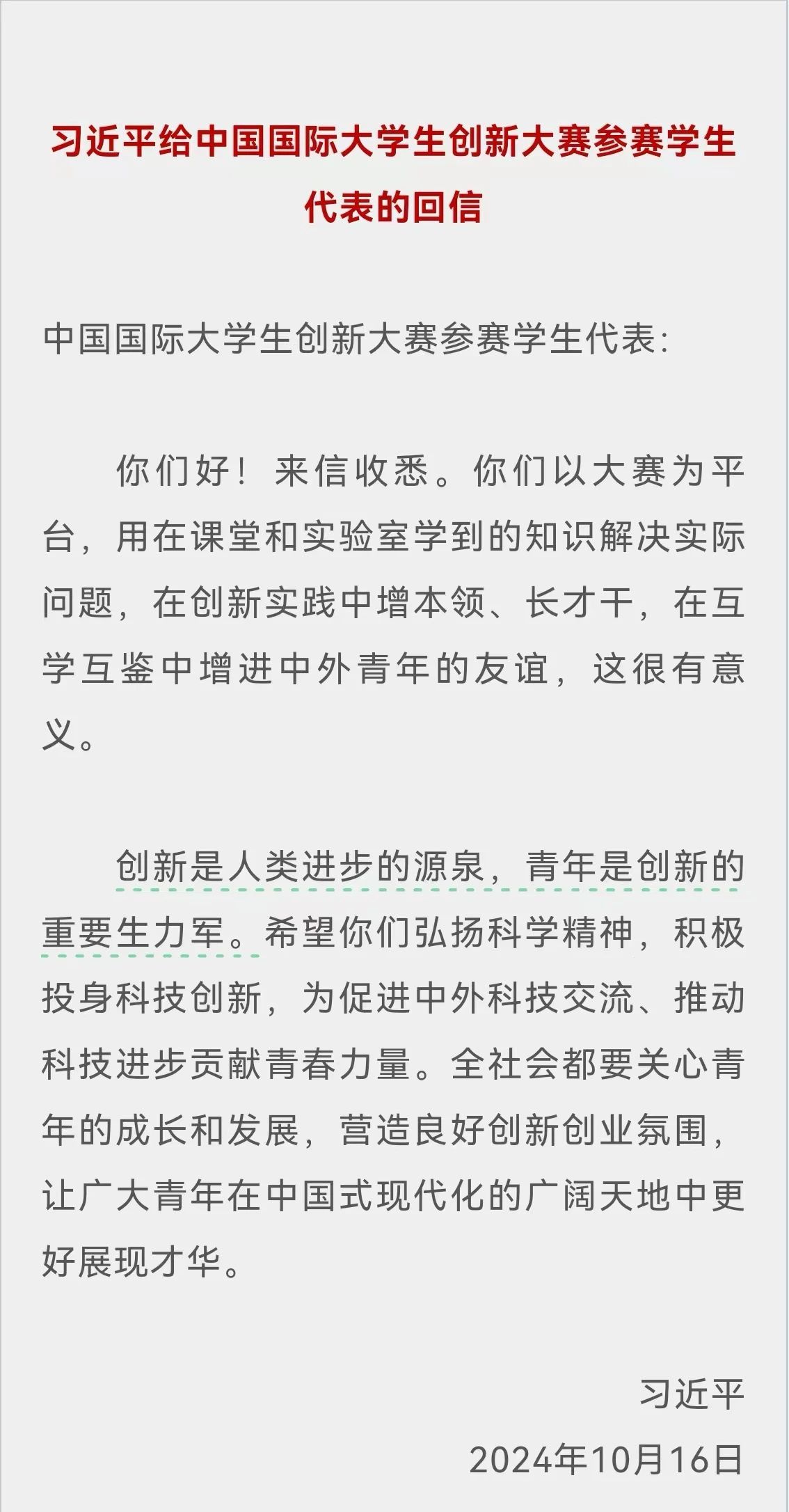习近平总书记回信勉励中国国际大学生创新大赛参赛学生代表,弘扬科学精神积极投身科技创新,为促进中外科技交流推动科技进步贡献青春力量。