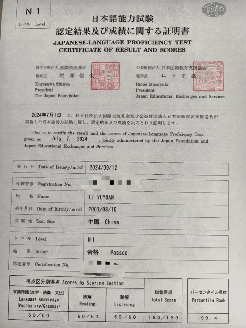 自2023年3月,也就是大一下学期起,我便踏上了备考JLPT的征程。首先,我挑战了N2考试,在同年12月以176分的成绩顺利通过。这次成功的经历极大地增强了我备战N1考试的信心。最终,在2024年7月,我以满分的成绩通过了N1考试。