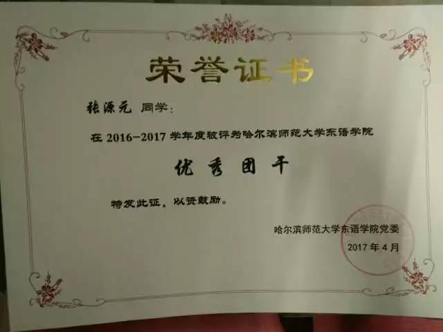 2015级日语一班团支书一职。张源元同学思想端正,学习刻苦,工作认真,勤俭节约,严于律己。做为一名班级干部,张源元同学一直认真完成团支书的本职工作,积极配合院系开展各项工作,组织形式多样的团日活动。在做好本职工作的同时,积极配合班长开展工作,使班级更具有凝聚力,成为一个积极向上的班集体。她以自己积极优异的学习成绩,踏实认真的工作作风得到了老师同学的一致好评。