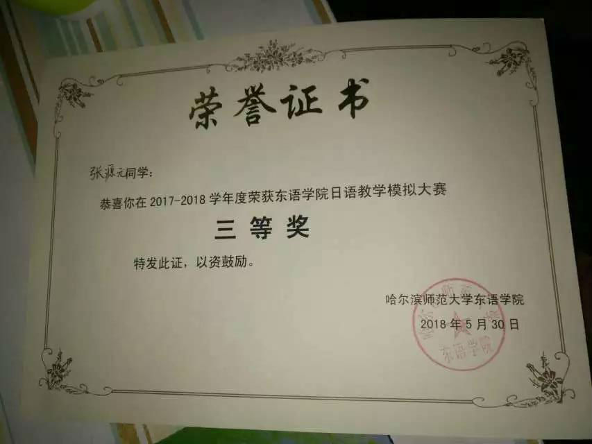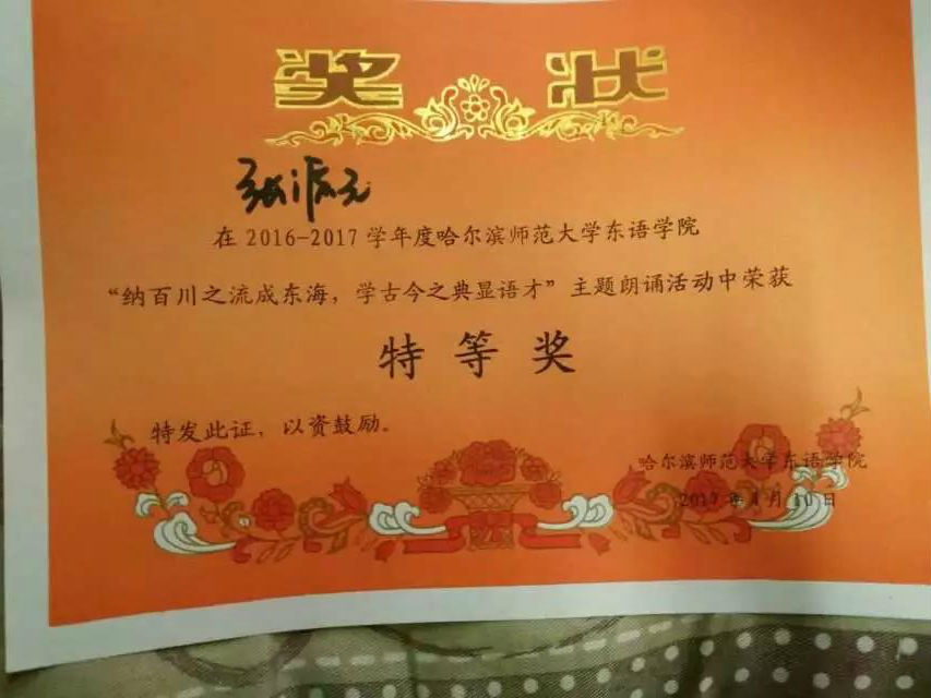 参加省级日语演讲比赛“纪念中日邦交正常化45周年‘新潟杯’2017日语演讲比赛”,获得了一等奖的好名次。在努力学习专业知识的同时,还一次性通过了英语六级考试,国家计算机考试二级考试。通过学习,不断充实和沉淀自己,做到不负学习的青春年华。