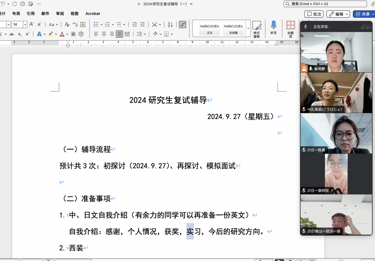 于9月27日举办了第一次考研复试指导,日语系教师崔艳鹏担任指导教师,4名日语专业推免考生参加了本次指导活动,本次活动预计开展3次。为便于师范类在外实习的考生顺利参与,本次指导活动采用腾讯会议平台,以在线方式完成指导。