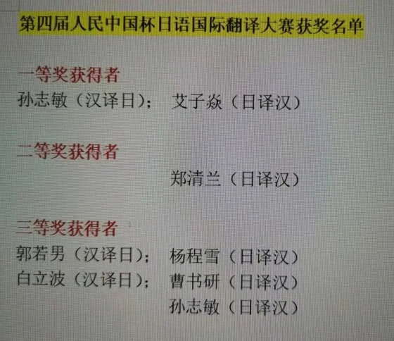 研究生孙志敏(汉译日)和艾子焱(日译汉)获得笔译一等奖,郑清兰(日译汉)获得笔译二等奖,郭若男、白立波获得汉译日笔译三等奖,曹书研、孙志敏、杨程雪获得日译汉笔译三等奖。