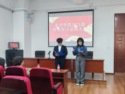 院长王琪、朝鲜语系主任张晓娜、日语系副主任张修志,带队教师杨希、刘洋、李洪旭、田辉出席实习总结大会,2021级日语(非师范)专业及朝鲜语专业全体学生参加大会。本次会议由2021日语(非师范)专业的林中涛同学、朝鲜语专业的张玘然同学主持。