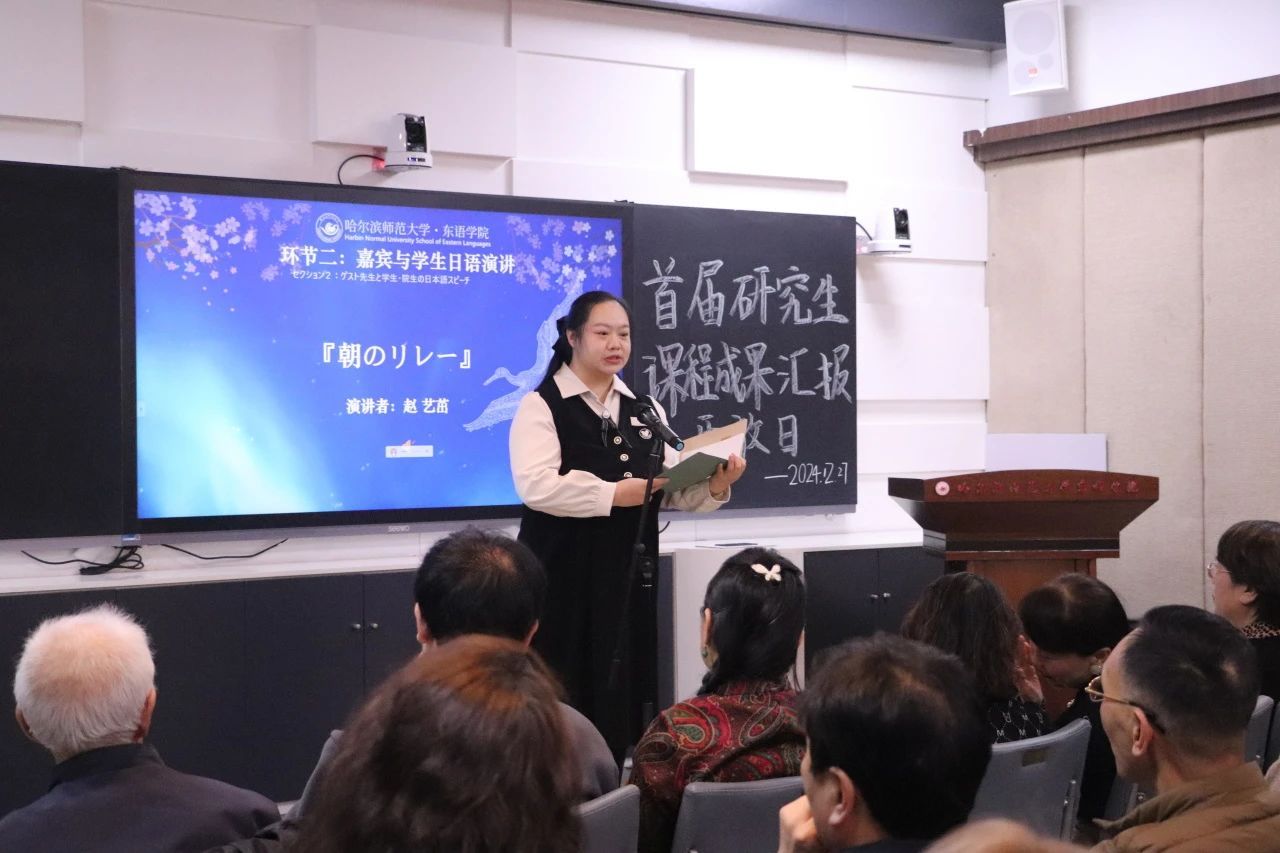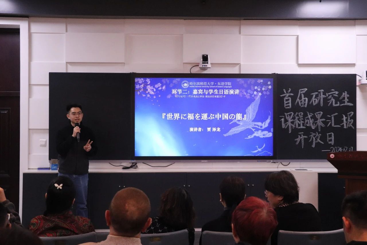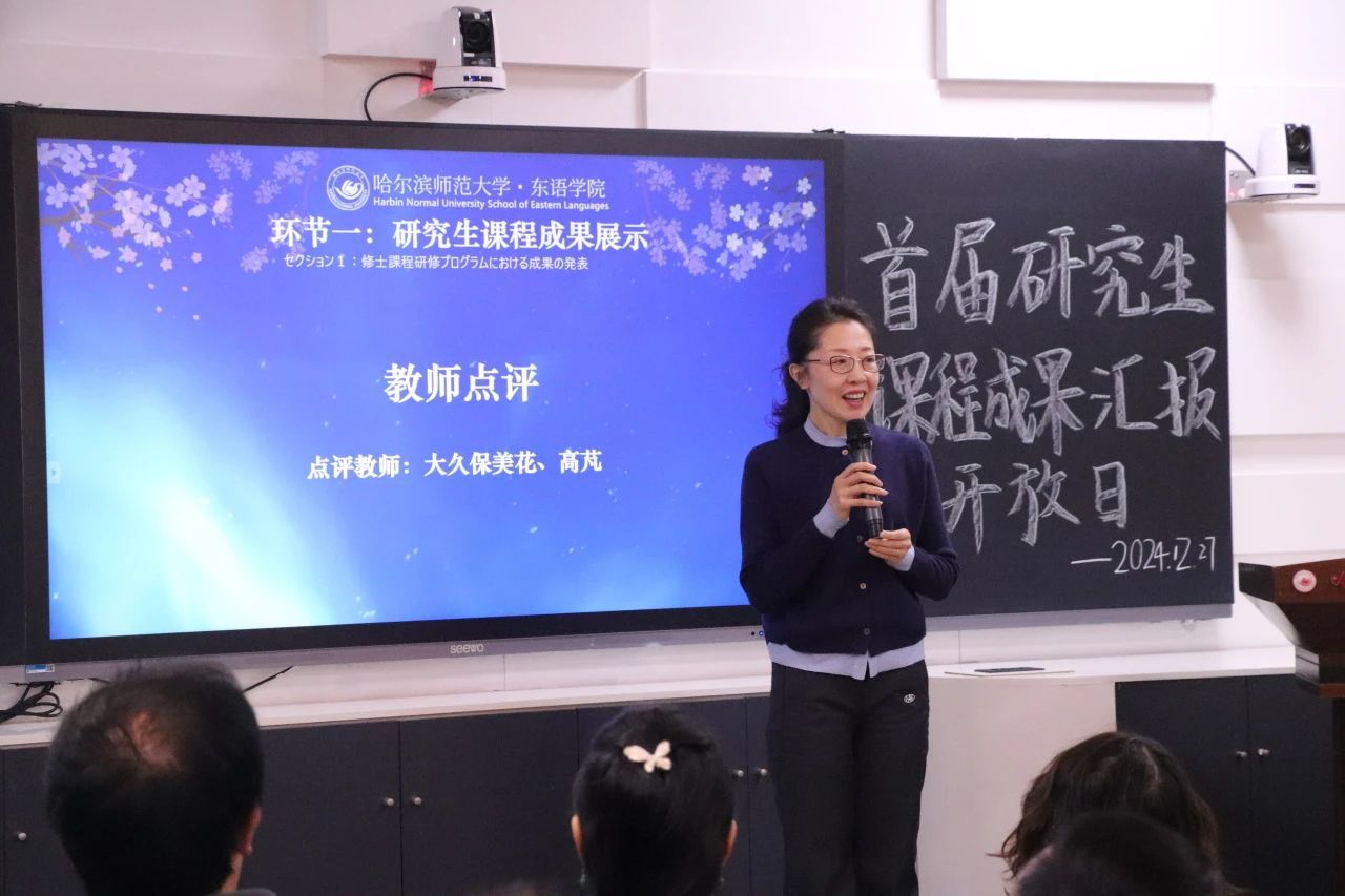为深入贯彻落实教育部关于促进研究生全面发展的指导方针,提升研究生教育质量,响应国家和社会对高层次人才的需求,积极推进研究生教育教学改革,2024年12月27日,搜搜啪 研究生课程成果汇报会在社科楼413室隆重举行。校教育督导委员会主任、原校党委副书记李庆霞,搜搜啪 党委书记包志伟,院长王琪,副院长郑杨等领导出席会议。搜搜啪 斯拉夫语学院副院长张金忠,黑龙江大学高芃教授团队,黑龙江外国语大学史琳副院长团队,哈尔滨日语沙龙会员应爽、李昌浩等受邀到会指导。学院教师代表、全体日语语言文学研究生参加会议。