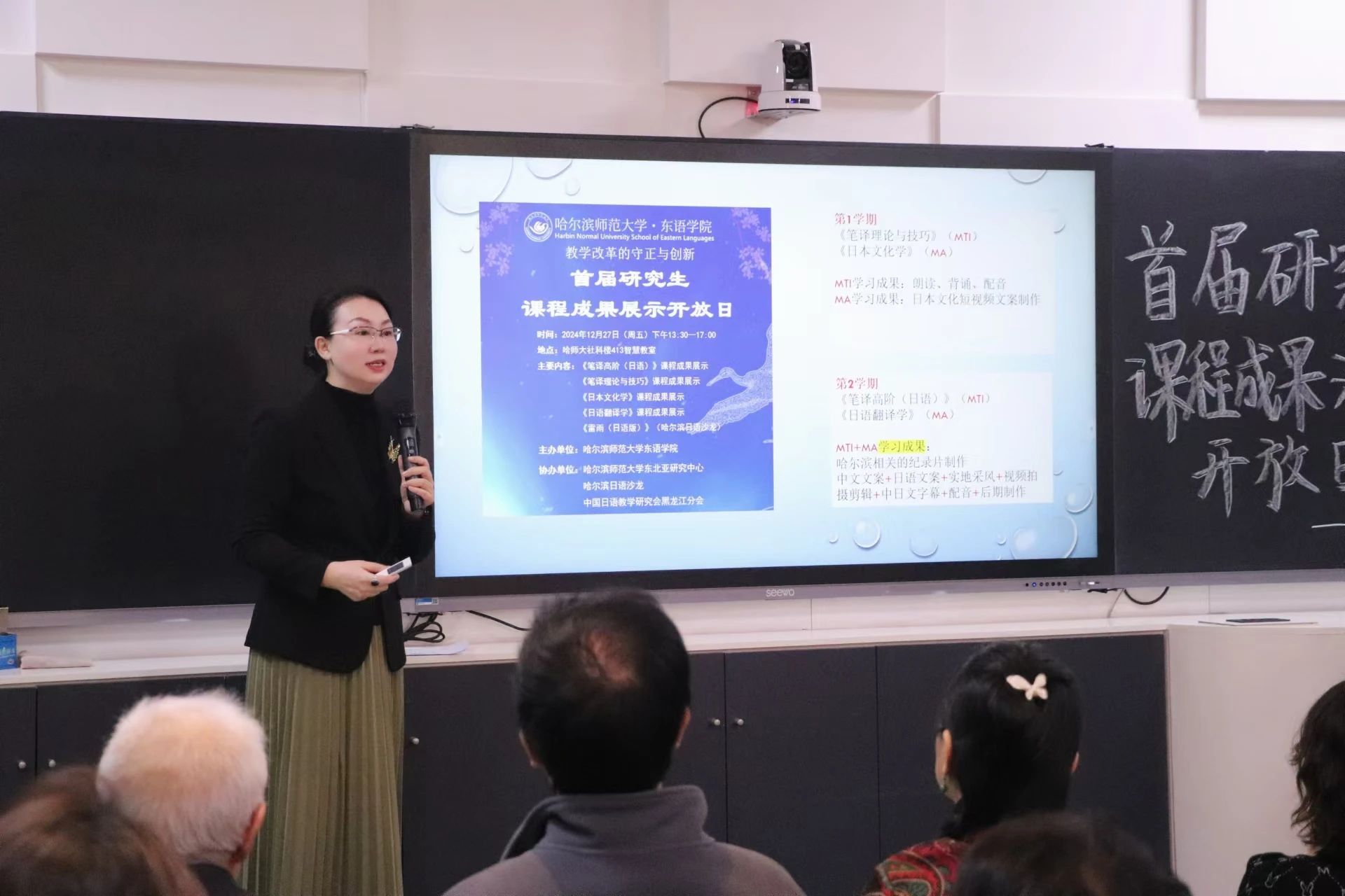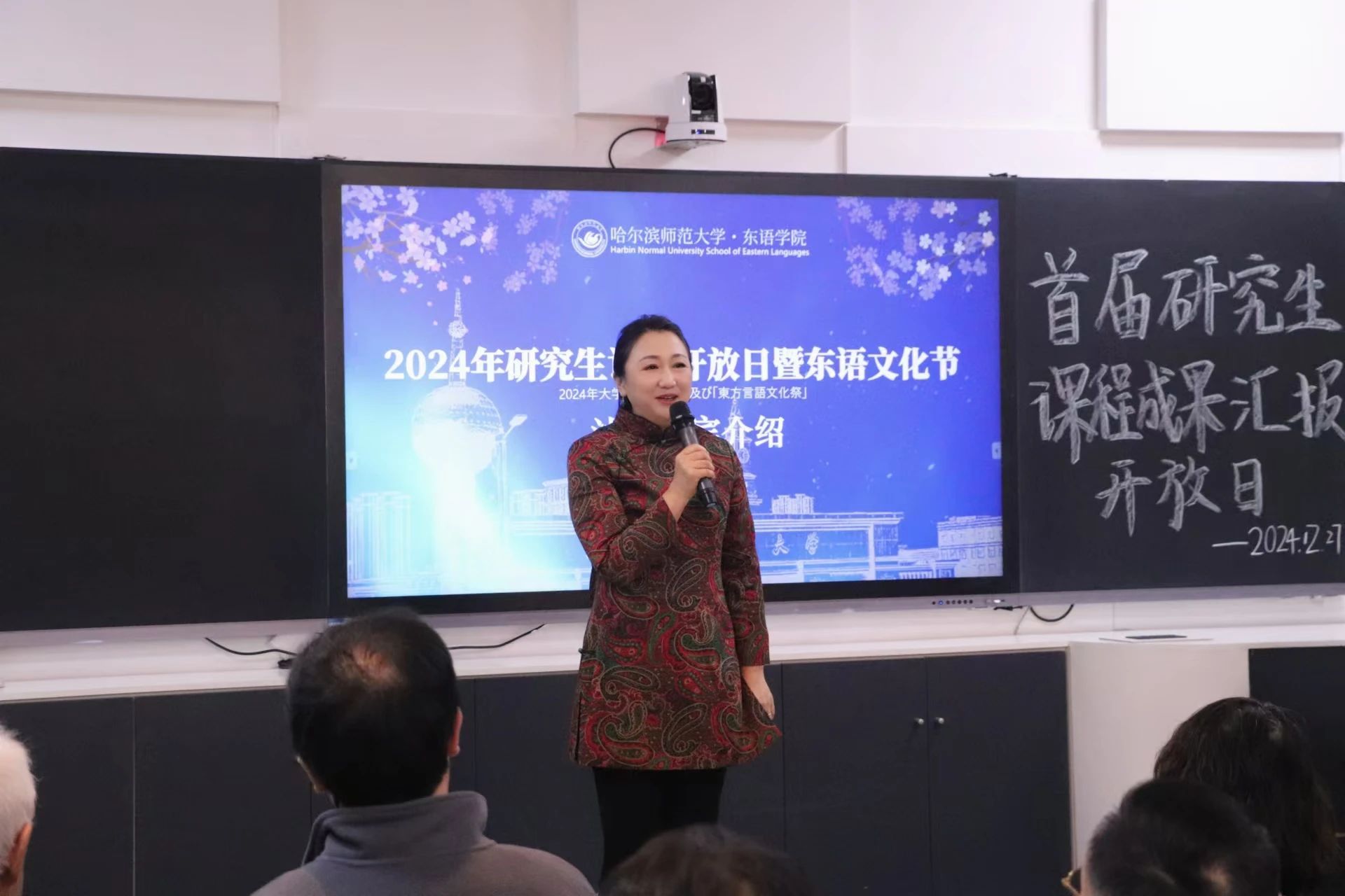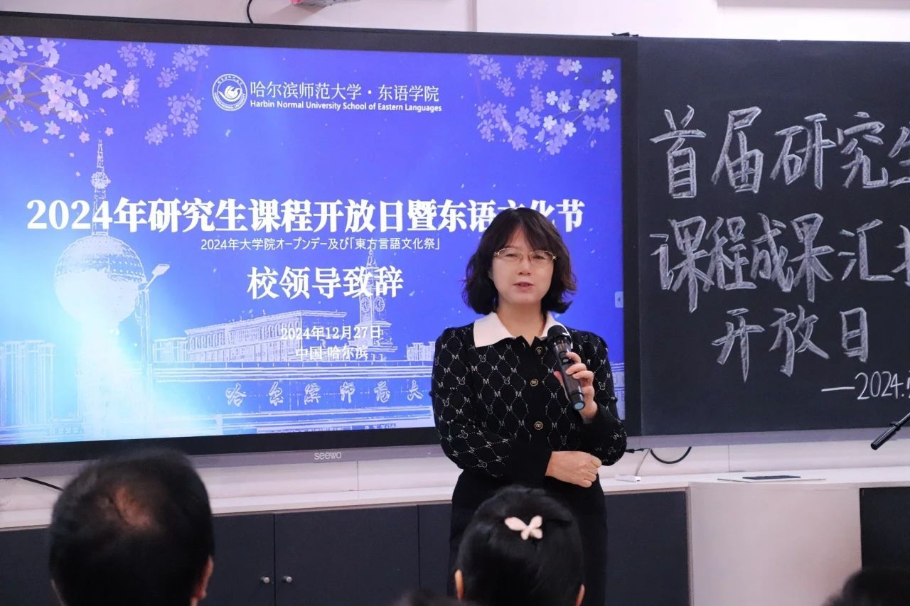 为深入贯彻落实教育部关于促进研究生全面发展的指导方针,提升研究生教育质量,响应国家和社会对高层次人才的需求,积极推进研究生教育教学改革,2024年12月27日,搜搜啪 研究生课程成果汇报会在社科楼413室隆重举行。校教育督导委员会主任、原校党委副书记李庆霞,搜搜啪 党委书记包志伟,院长王琪,副院长郑杨等领导出席会议。搜搜啪 斯拉夫语学院副院长张金忠,黑龙江大学高芃教授团队,黑龙江外国语大学史琳副院长团队,哈尔滨日语沙龙会员应爽、李昌浩等受邀到会指导。学院教师代表、全体日语语言文学研究生参加会议。