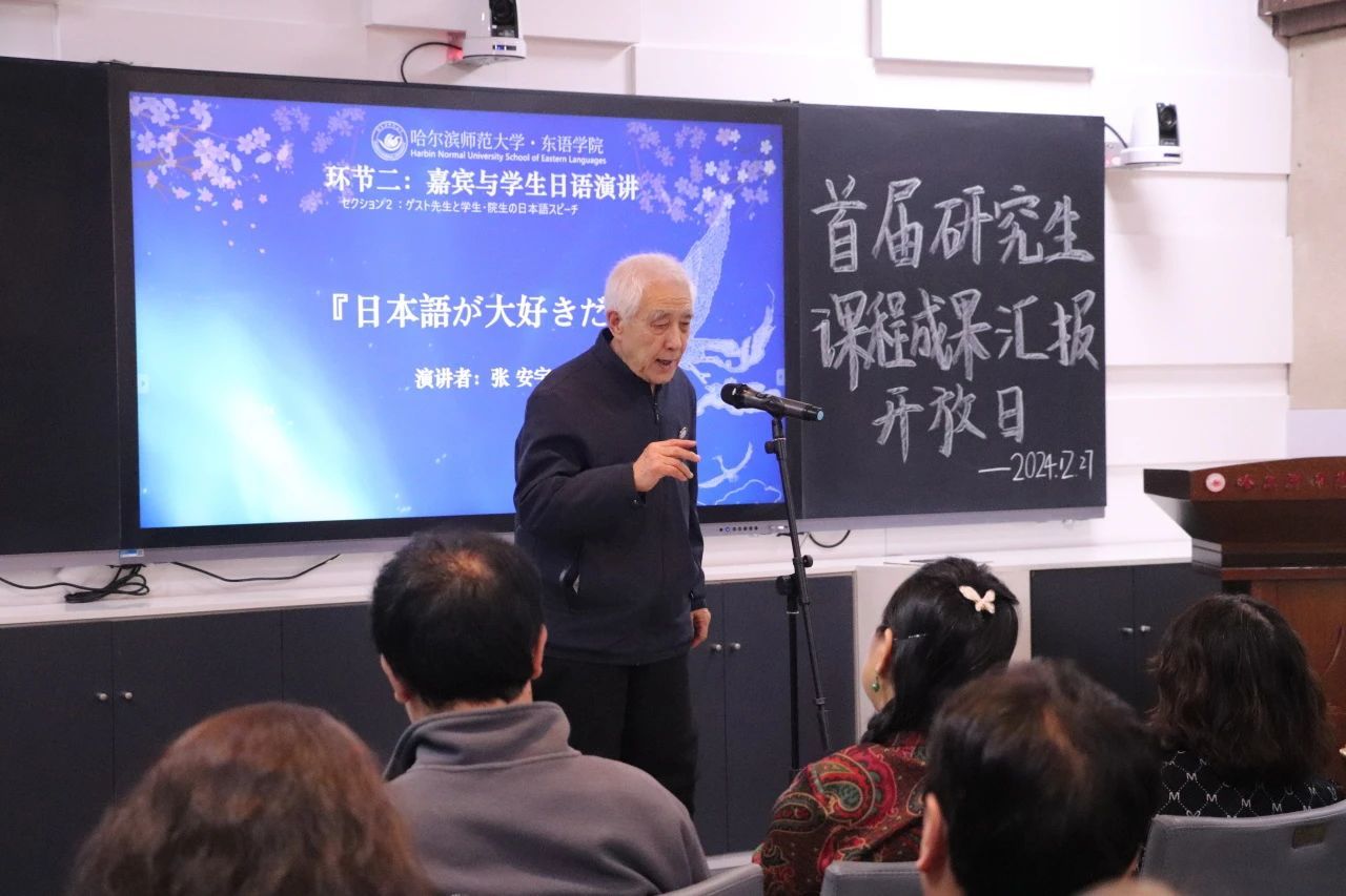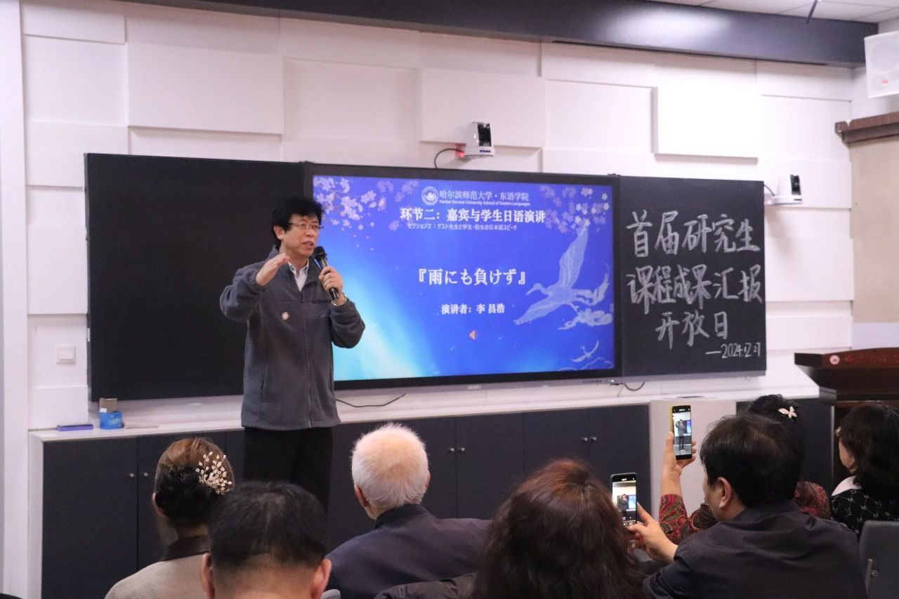 翻译硕士二年级的贾泽龙同学展示了在省级演讲比赛中荣获一等奖的作品《世界に福を運ぶ中国の龍(送给世界的龙运福音)》,而一年级赵艺茁同学则朗诵了《朝のリレー(朝阳的接力)》。尤其引人注目的是,80岁高龄的日语沙龙成员张安宇的演讲《日本語が大好きだ(我最喜欢的日语)》和李昌浩的《雨にも負けず(不畏风雨)》,他们的热情和才华引发了全场的热烈反响,激励了在场的研究生反思并提升他们的日语学习热情。