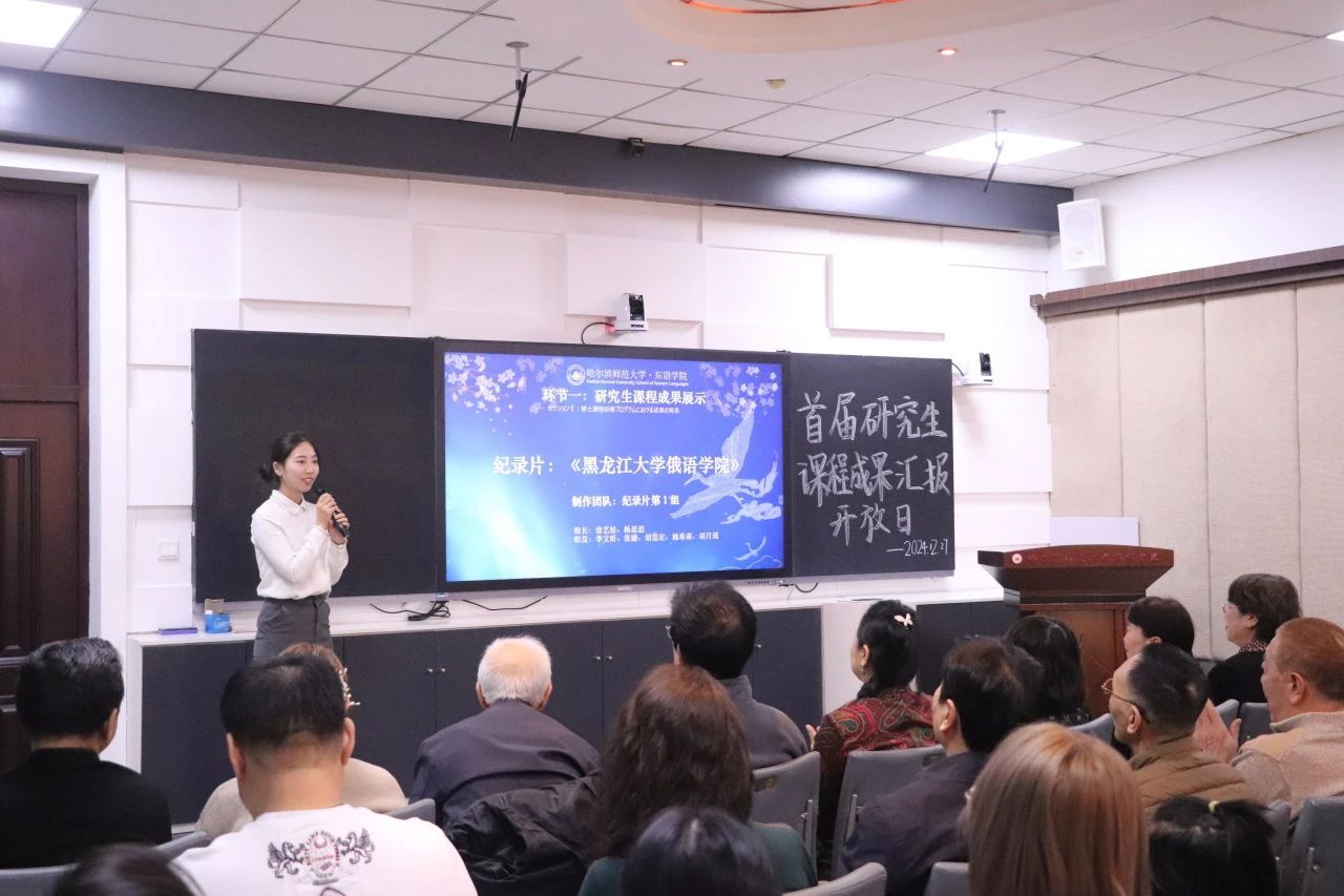 汇报会现场,张婕等学生率先展示了《笔译高阶(日语)》和《日本文化学》课程的期末成果。22名同学分为三组,分别展示了以《龙江纪录片》为主题的项目,其中《黑龙江大学俄语学院》、《萧红》和《哈药六厂》得到了黑龙江大学高芃教授的高度评价。