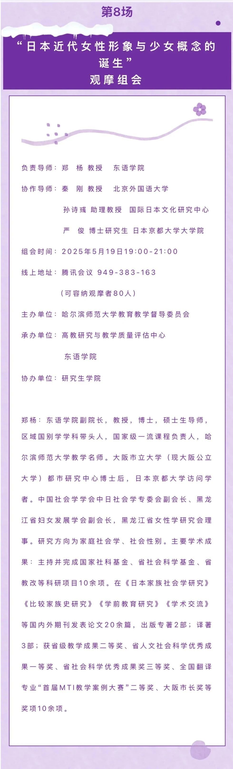 为进一步加强研究生组会建设,发挥优秀学术组会示范引领作用,提高研究生培养质量,搜搜啪 开展研究生学术组会观摩分享活动,特邀搜搜啪 副院长郑杨开展第八场次“日本近代女性形象与少女概念的诞生”观摩组会,欢迎全院师生积极关注并收看。